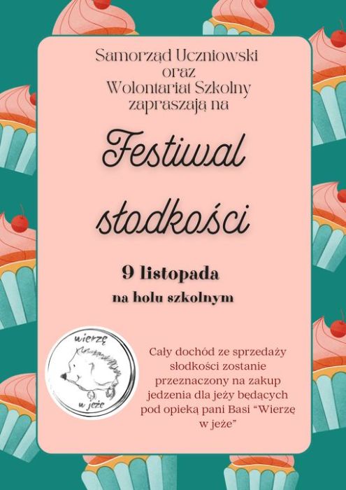 Już w najbliższy czwartek Samorząd Uczniowski i Wolontariat Szkolny zapraszają na Festiwal Słodkości. Dochód ze sprzedaży babeczek zostanie przeznaczony na zakup jedzenia dla jeży będących pod opieką pani Basi „Wierzę w jeże”. Jeśli ktoś chce zakupić większą ilość słodkości do domu to prosimy o zabranie ze sobą pojemnika. Zapraszamy, będzie pysznie!