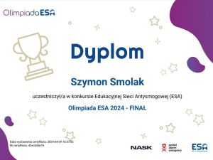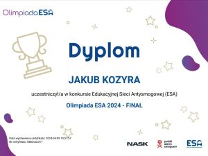 Jakub Kozyra, Szymon Smolak, Filip Kulon i Julian Antosik uczestniczyli w Ogólnopolskiej Olimpiadzie Antysmogowej – Konkursie Wiedzy o Powietrzu i Zmianach Klimatu. Organizatorem Olimpiady była Naukowa i Akademicka Sieć Komputerowa – Państwowy Instytut Badawczy z siedzibą w Warszawie. Konkurs miał zasięg krajowy i składał się trzech etapów (etapu I – szkolnego, etapu II – wojewódzkiego, etapu ogólnopolskiego – finału). Olimpiada na każdym etapie składała się z 40 zadań. Jakub i Szymon dotarli w tej rywalizacji do etapu finałowego i zabrakło im naprawdę niewiele, aby stać się laureatami konkursu. Już sama kwalifikacja do finału to był ogromny sukces, ponieważ byli jedynymi reprezentantami naszego województwa. Ogromne gratulacje!