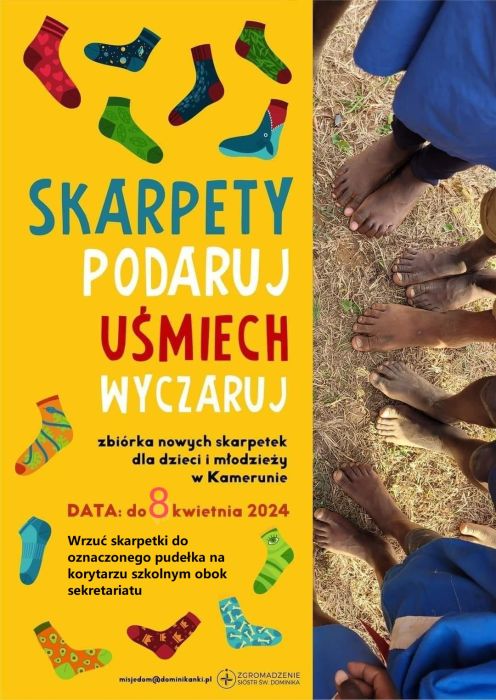 W tym roku nasza szkoła włączyła się w akcję „Skarpety podaruj, uśmiech wyczaruj”. Zbieramy nowe skarpety dla dzieci i młodzieży w Kamerunie. Ubierają je tylko na specjalne okazje…
