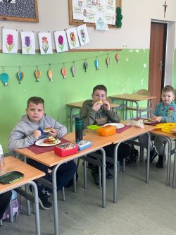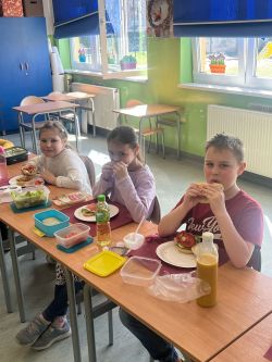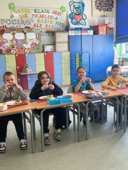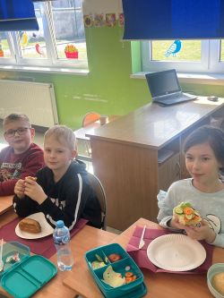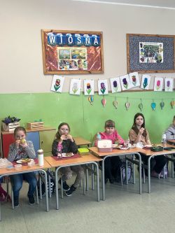 9 kwiecień upłynął uczniom klasy 2c pod hasłem „w zdrowym ciele zdrowy duch” . Dzień ten poświęciliśmy tematyce zdrowego odżywiania oraz dbania o swój organizm. Oglądaliśmy filmy poświęcone zbilansowanej diecie, stworzyliśmy piramidy żywieniowe i przygotowaliśmy pyszne, kolorowe kanapki, które z wielką ochotą znikały z talerzyków. Teraz już wiemy jak żyć i co jeść, by mieć więcej energii do zabawy i zapału do nauki.