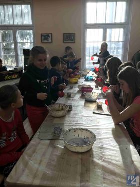 Po krótkim zwiedzaniu uczniowie przeszli na warsztaty edukacyjne i spróbowali swoich sił w dekorowaniu swoich bombek. Do dyspozycji mieli klej i wiele kolorów brokatu oraz własny talent. Powstawały indywidualne bombki, które uczestnicy zabrali do domu. Była to ciekawa lekcja, którą wszystkim polecamy.